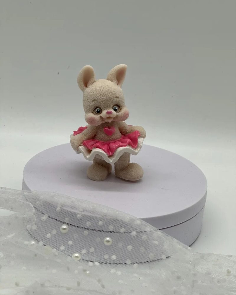 Handgefertigter grauer Hase mit Rose in Geschenkbox für zarte Herzensgrüße